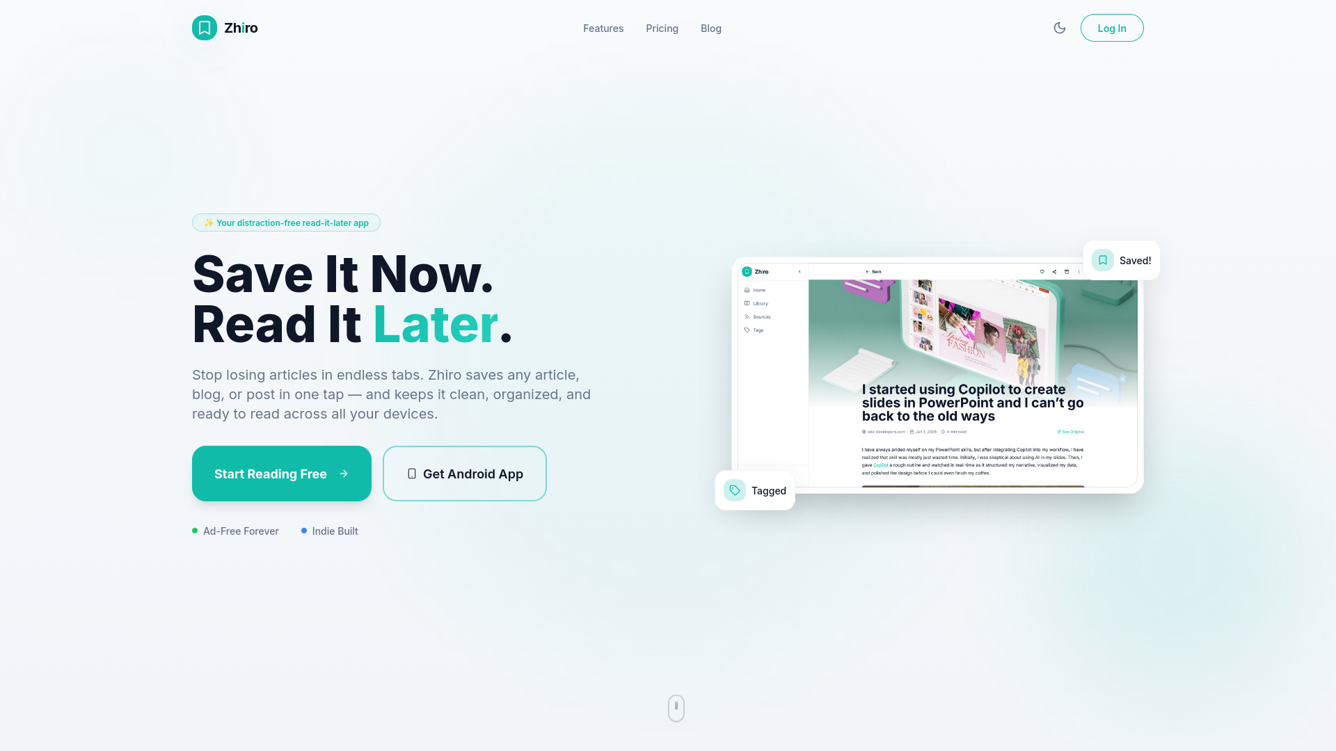 I used to save articles by sending them to myself on WhatsApp, but I never went back to read them. It was messy, unorganized, and easy to forget. So I built a simple system where saving and reading later is actually frictionless. Zhiro lets you save articles cleanly, organize them with tags, and come back to them anytime, with features like summaries and audio to make consumption easier.